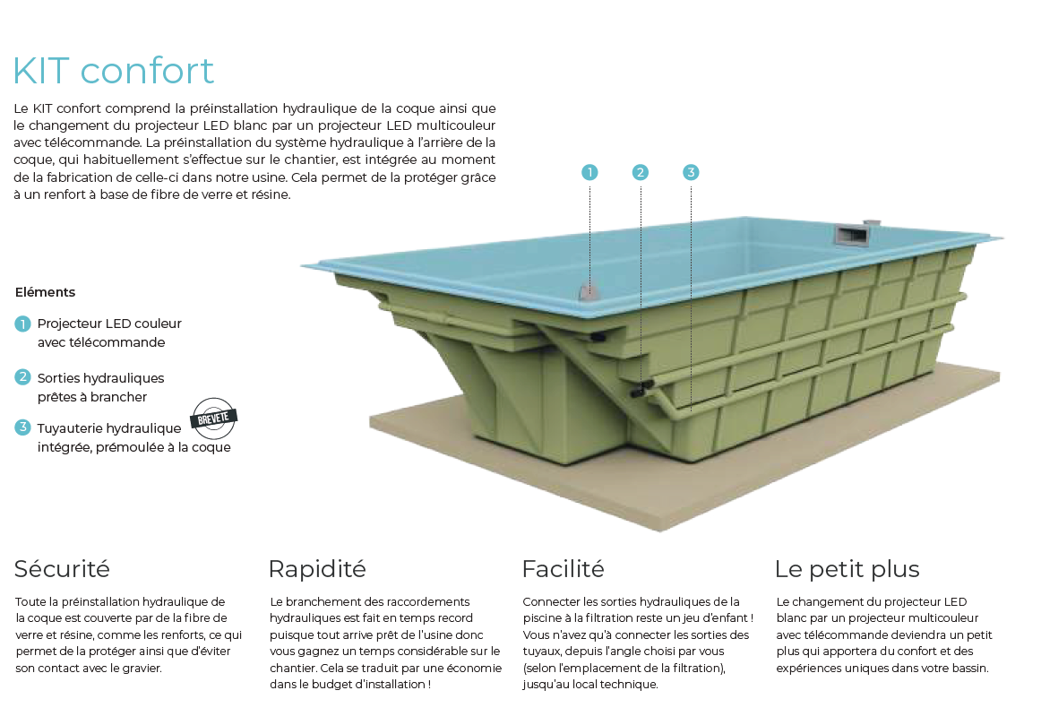 Inclus : Skimmer, buses de refoulement, bonde de fond, bonde de sécurité, projecteur LED couleur avec télécommande